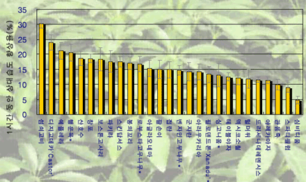 도표. 식물 종류별 1.728m3의 공간내 20% 투입시 1시간 동안 상대습도 향상 능력 비교