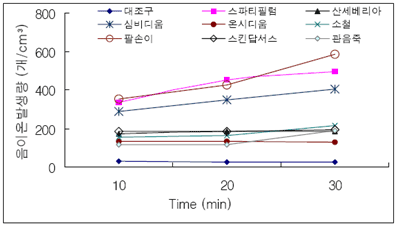 도표. 식물 종류별 시간에 따른 음이온 발생량 변화
