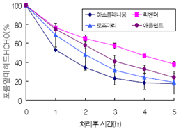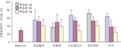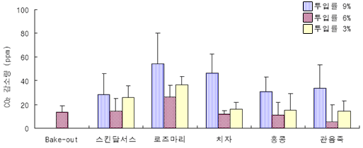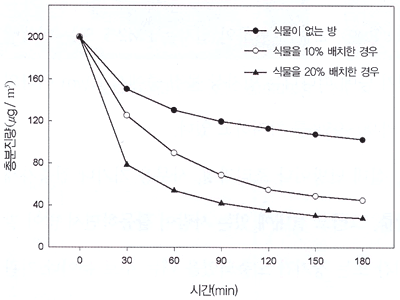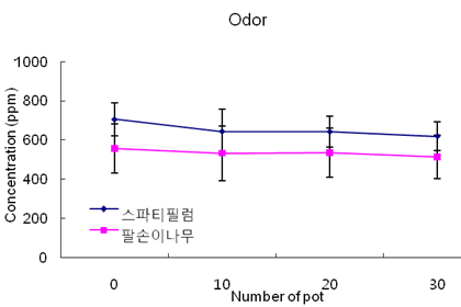 도표. 생활공간(7.3평) 식물 투입수에 따른 악취 제거 효과포름알데히드는 각종 건축자재나 가구류의 방부제나 접착제 등에서 많이 발생하며 새집증후군의 주요 원인물질로 알려져 있다.