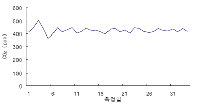 도표. 생활공간 실험기간 동안 빈방의 이산화탄소 변화