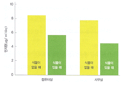 도표. 컴퓨터실과 일반 사무실에서 식물투입에 따른 먼지 측정량 비교
